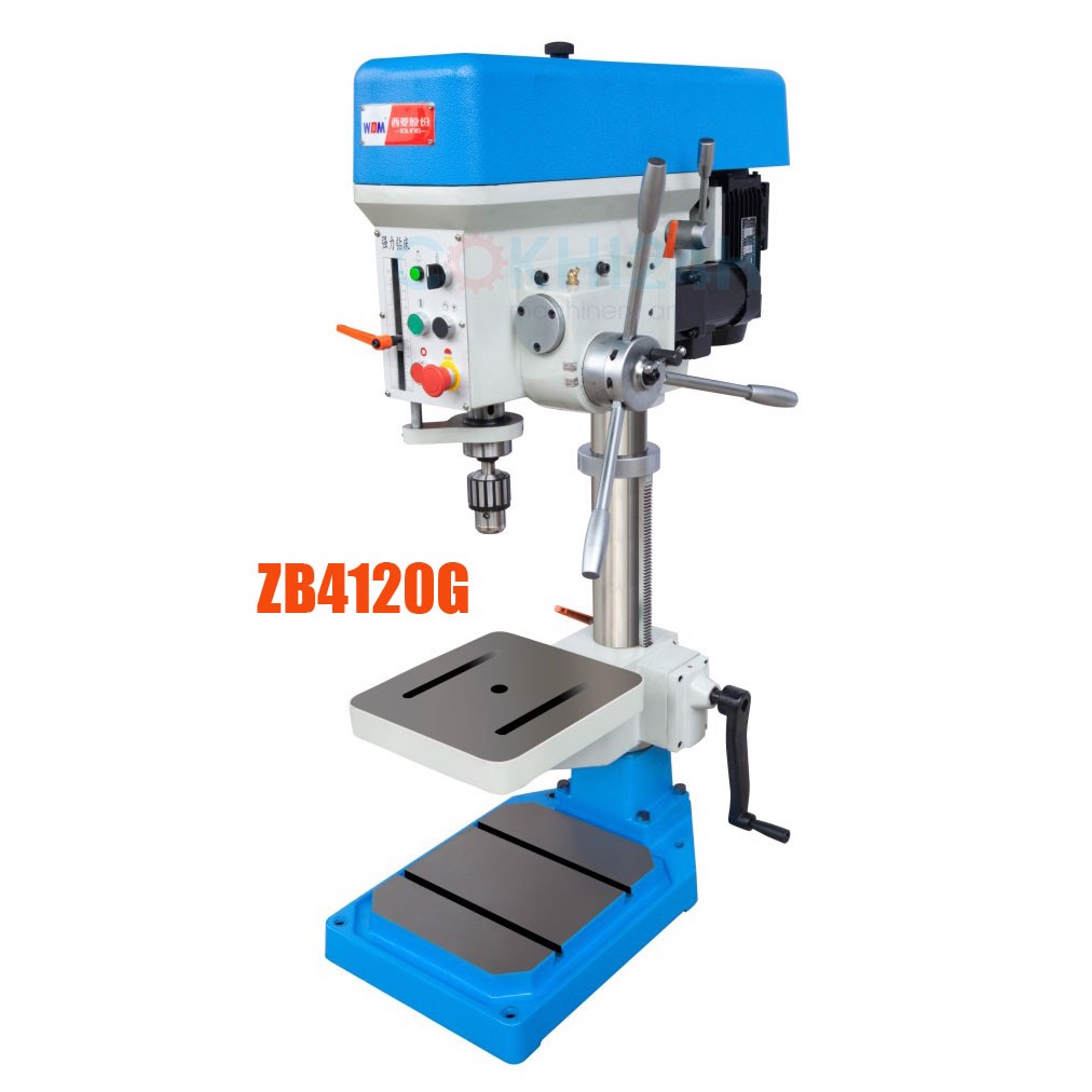 Máy khoan bàn tự động ăn phôi (auto feed) hiệu WDDM model ZB4120G với khả năng khoan lỗ một cách tự động hoặc kéo bằng tay, công suất làm việc ở mức trung bình (20mm).
